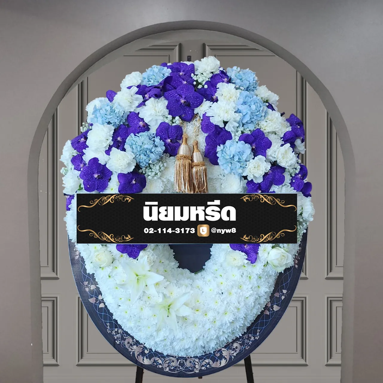 การส่งพวงหรีดเป็นการแสดงความเคารพในระยะยาวสำหรับทั้งสองฝ่าย การให้เกียรติและความสำรวม เพื่อให้การยกย่องด้วยความรัก ง่าย ๆ แต่สง่างามนี้ พวงหรีดจะแสดงให้เห็นถึงการสนับสนุนและความรักของคุณอย่างแท้จริง โทนสีม่วงมักใช้แสดงความอาลัยให้แก่ผู้อาวุโส หรือผู้ส่งพวงหรีดอาจเป็นผู้อาวุโสเอง รวมไปถึงหน่วยงานที่ต้องการให้ดูน่าเชื่อถือ เพราะสีม่วงคือสีแห่งเกียรติยศ ให้ความรู้สึกหรูหราแต่ดูสุขุม ขนาดพวงหรีดบอร์ดพิมพ์ลาย (วงรี) กว้าง 70-85 เซนติเมตร สูง 90-100 เซนติเมตร วัสดุบอร์ด ตกแต่งลวดลายกราฟิกสมัยใหม่ มาในโทนสีหรูหราสง่างาม เพื่อให้พวงหรีดของคุณดูสวยโดดเด่นเมื่อถูกจัดวางในงานพิธีที่สำคัญเช่นนี้