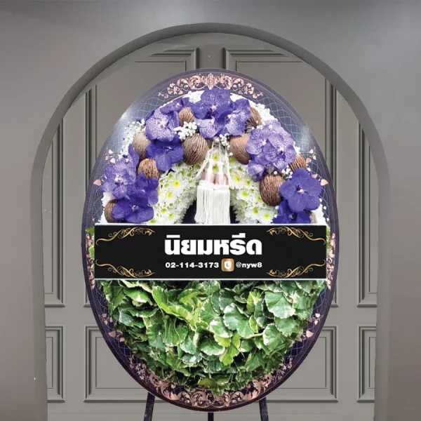 การส่งพวงหรีดเป็นการแสดงความเคารพในระยะยาวสำหรับทั้งสองฝ่าย การให้เกียรติและความสำรวม เพื่อให้การยกย่องด้วยความรัก ง่าย ๆ แต่สง่างามนี้ พวงหรีดจะแสดงให้เห็นถึงการสนับสนุนและความรักของคุณอย่างแท้จริง โทนสีม่วงมักใช้แสดงความอาลัยให้แก่ผู้อาวุโส หรือผู้ส่งพวงหรีดอาจเป็นผู้อาวุโสเอง รวมไปถึงหน่วยงานที่ต้องการให้ดูน่าเชื่อถือ เพราะสีม่วงคือสีแห่งเกียรติยศ ให้ความรู้สึกหรูหราแต่ดูสุขุม ขนาดพวงหรีดบอร์ดพิมพ์ลาย (วงรี) กว้าง 70 เซนติเมตร สูง 90 เซนติเมตร วัสดุบอร์ด ตกแต่งลวดลายกราฟิกสมัยใหม่ มาในโทนสีหรูหราสง่างาม เพื่อให้พวงหรีดของคุณดูสวยโดดเด่นเมื่อถูกจัดวางในงานพิธีที่สำคัญเช่นนี้