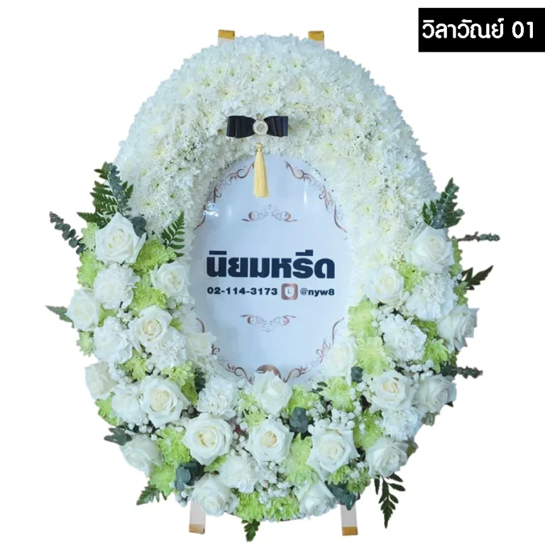 - ขอสงวนสิทธิ์ในการเปลี่ยนแปลง “ชนิดดอกไม้ที่ใช้ตกแต่ง” ตามความเหมาะสมในแต่ละฤดูกาล โดยให้ภาพรวมและคุณภาพอยู่ระดับเดียวกับรูปแบบพวงหรีดที่เลือก