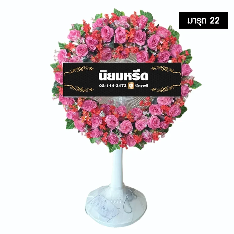พวงหรีดดอกไม้สด ขนาด 90 ซม. โดยประมาณ โทนสีสดใสประกอบด้วยสี ขาว ม่วง ชมพู และประดับโบว์แดง เพื่อความอ่อนหวาน สดใส แต่ยังดูสุภาพสง่างาม เหมาะแก่การนำไปแสดงความอาลัยทุกประเภท เพื่อให้คุณได้มอบให้ผู้ล่วงลับครั้งสุดท้ายอย่างสง่างามมากที่สุด