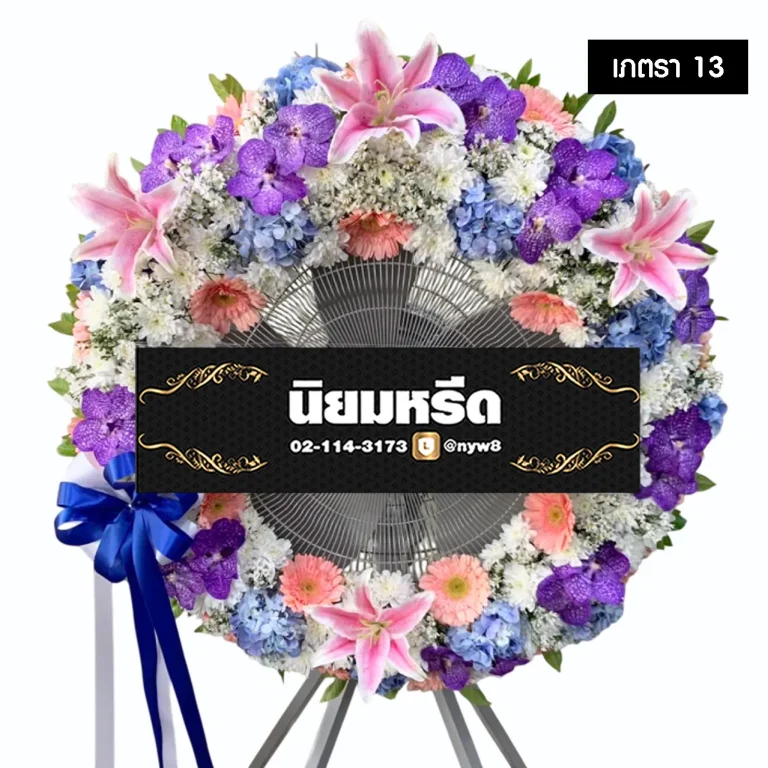 พวงหรีดเสื่อกก ประดับตกแต่งดอกไม้และริบบิ้น ขนาดเส้นผ่าศูนย์กลางโดยประมาณ 110 * 200 cm
